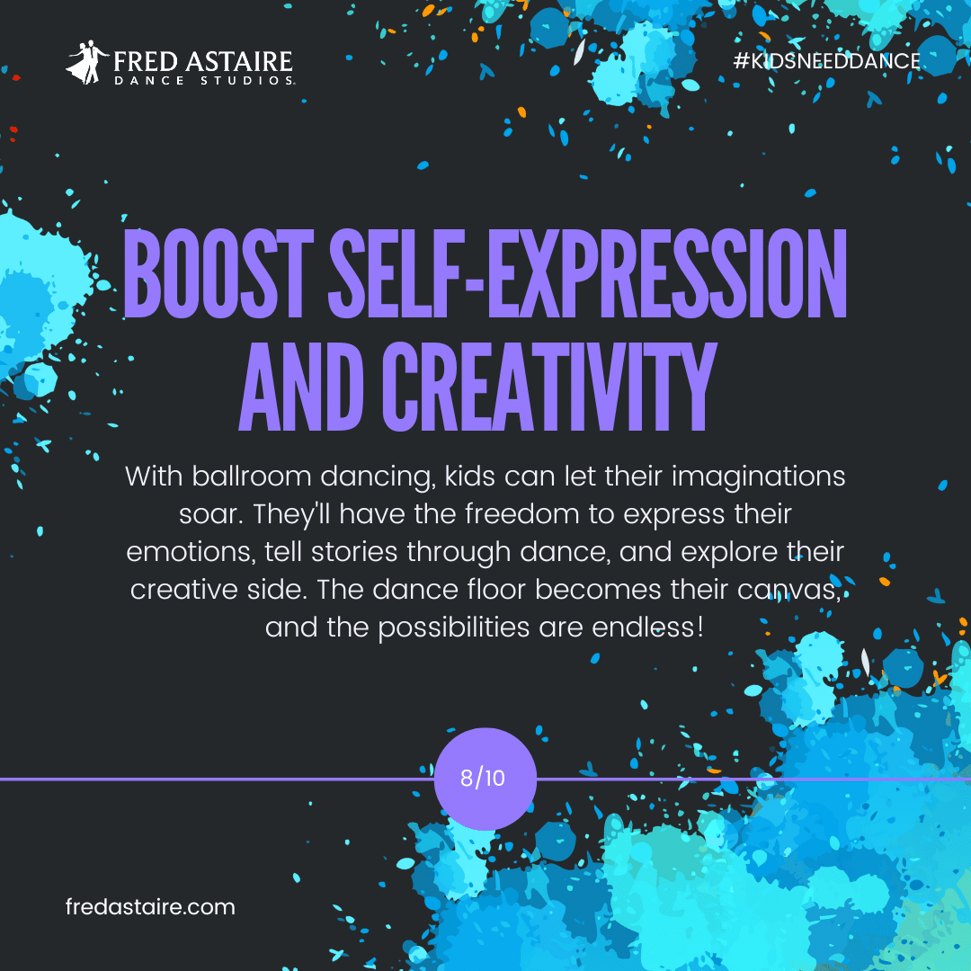 Ballroom dancing lets kids unleash their imaginations. They’ll have the freedom to express their emotions, tell stories through dance, and explore their creative side. The dance floor becomes their canvas, and the possibilities are endless, making each dance a unique masterpiece.