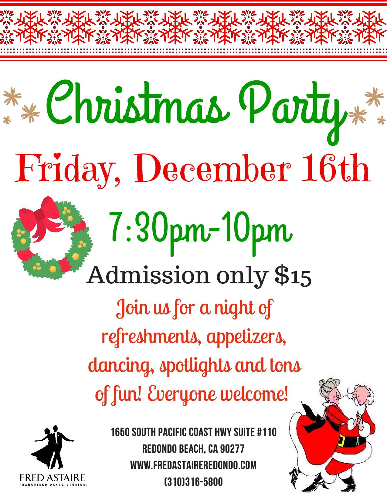 One, it’s a Christmas Party. Two, it’s at our studio, with all of your dance friends, your favorite instructors, the whole Fred Astaire family. Three, you can’t beat the price (tickets are $15 per person).